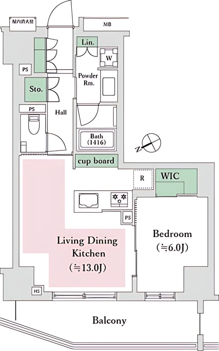 - 49.28㎡のゆとりある1LDKタイプで、LDKは12帖以上と開放感のある空間設計です。リビングと寝室をしっかり分けられるため、在宅ワークの方や二人入居にもおすすめです!ウォークインクローゼットやシューズWICもあり、収納力も非常に充実しています!